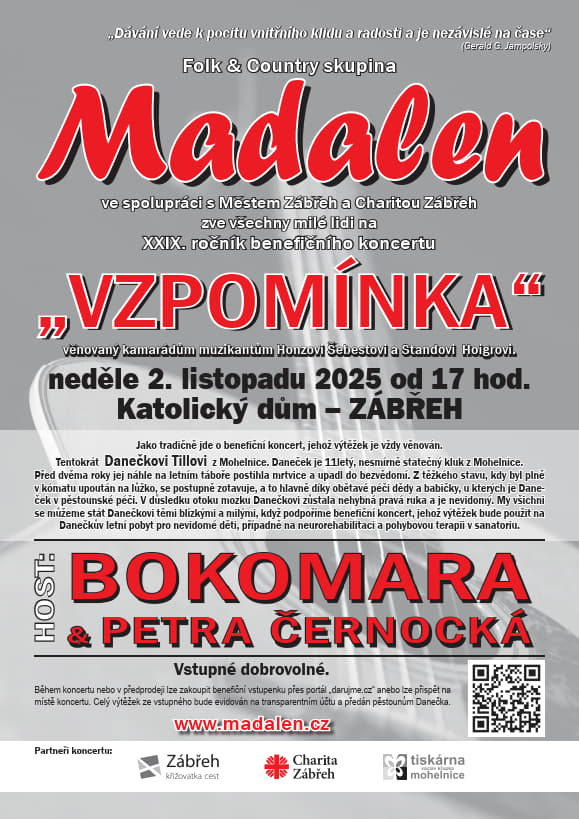 Tradiční benefiční koncert skupiny MADALEN - Vzpomínka se uskuteční v neděli 5.11. od 17h v Katolickém domě Zábřeh. Letošním hostem bude jihočeská folková skupina EPYDEMYE, držitel Anděla 2015. Další podrobnosti připravujeme :-)